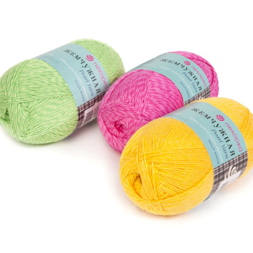Многоцветье палитры цветов позволяет создавать не только изящные однотонные изделия, но и сочетать разные по цвету нити, что добавляет “изюминки” вязаным из “Жемчужной” вещам.