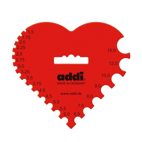 Измеритель спиц и крючков addi из прочного пластика в виде красного сердечка, 10шт в упаковке.