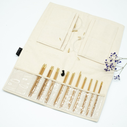 – пенал из 100% небелёного хлопка с двумя рядами по 13 карманов для спиц и 8 карманов для лесок и аксессуаров.